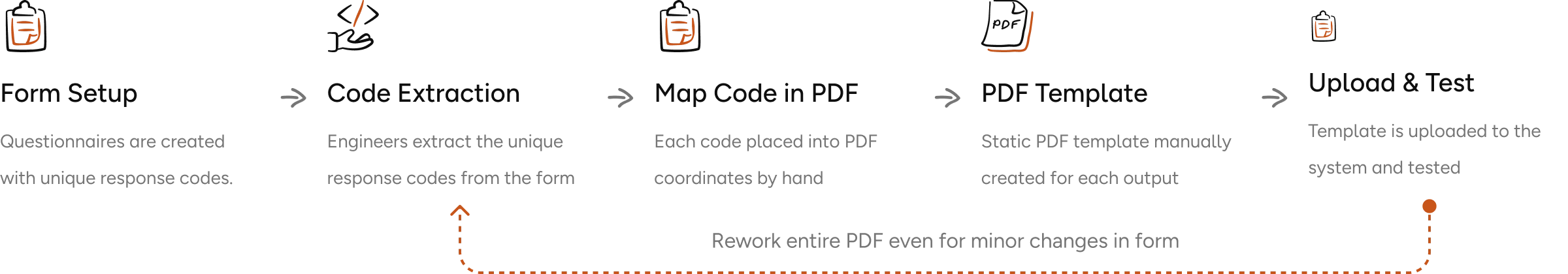 But creating these outputs was a long, manual, engineering-heavy process that involved third party tools. Engineers had to extract response codes from the forms, recreate layouts in third-party PDF tools, map each code to the correct fields, and repeatedly upload and test the output. Even small changes required rebuilding the entire document. What should have taken hours often took days.